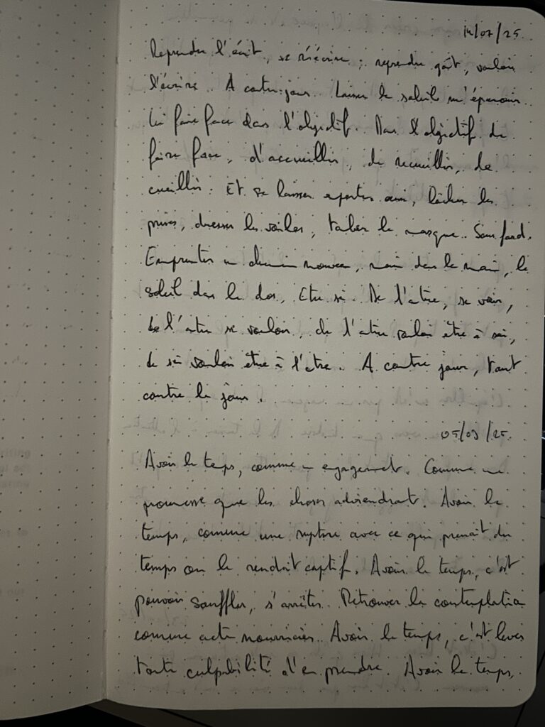 Avoir le temps, comme un engagement. Comme une promesse que les choses adviendront. Avoir le temps, comme une rupture avec ce qui prenait du temps ou le rendait captif. Avoir le temps, c’est pouvoir souffler, s’arrêter. Retrouver la contemplation comme acte nourricier. Avoir le temps, c’est lever toute culpabilité d’en prendre. Avoir le temps, c’est aussi créer de l’espace et se permettre d’envisager demain comme un autre aujourd’hui. Avoir le temps, c’est s’autoriser de profiter du présent. Enfin. Me donner le temps, c’est m’octroyer l’espace d’être qui je suis. Enfin. Enfin. Enfin un début.